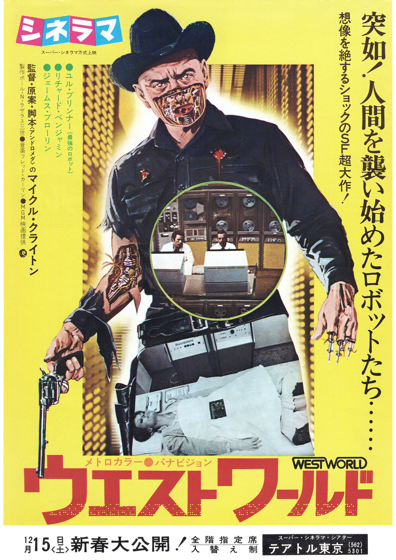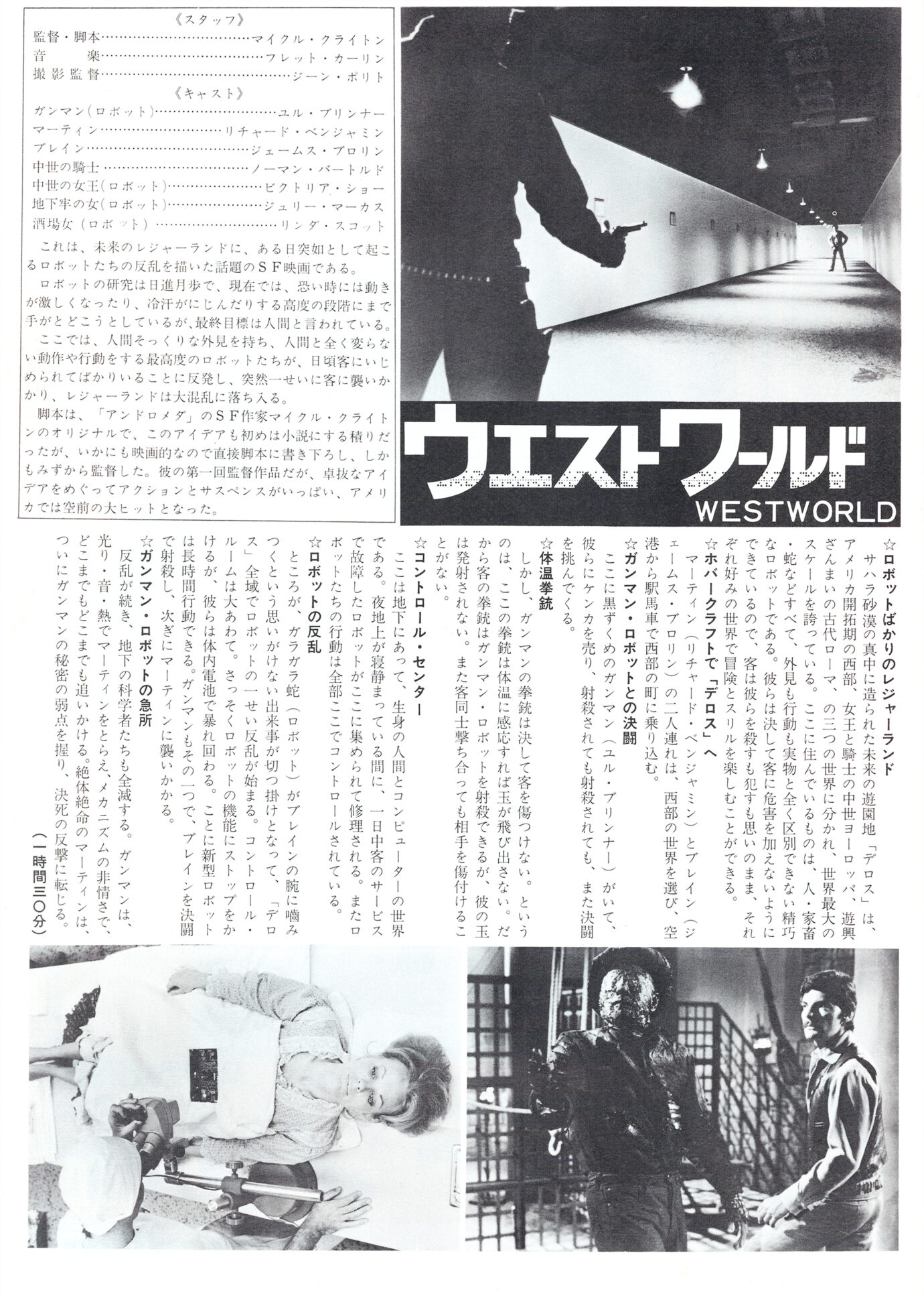 日本公開当時、小学生だった自分にとって本作は、SFと西部劇の融合という発想よりも、娯楽作とは思えない不気味さや怖さが強く印象に残る映画でした。とりわけ印象的なのが、主演にユル・ブリナーが起用されていた点でした。『荒野の七人』で知られるガンマンのイメージを背負った彼が、未来世界における無敵のガンマンとして登場することで、時代の交錯という設定に強い説得力が生まれています。